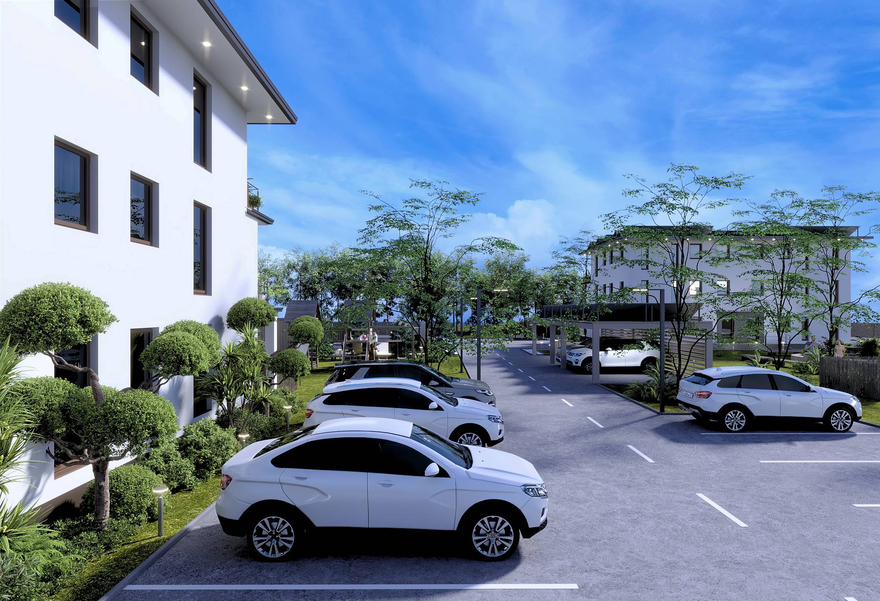 Spatiile verzi dintre imobile, organizarea integrală a parcărilor în incinta ansamblului și proportiile echilibrate definesc caracterul proiectului.