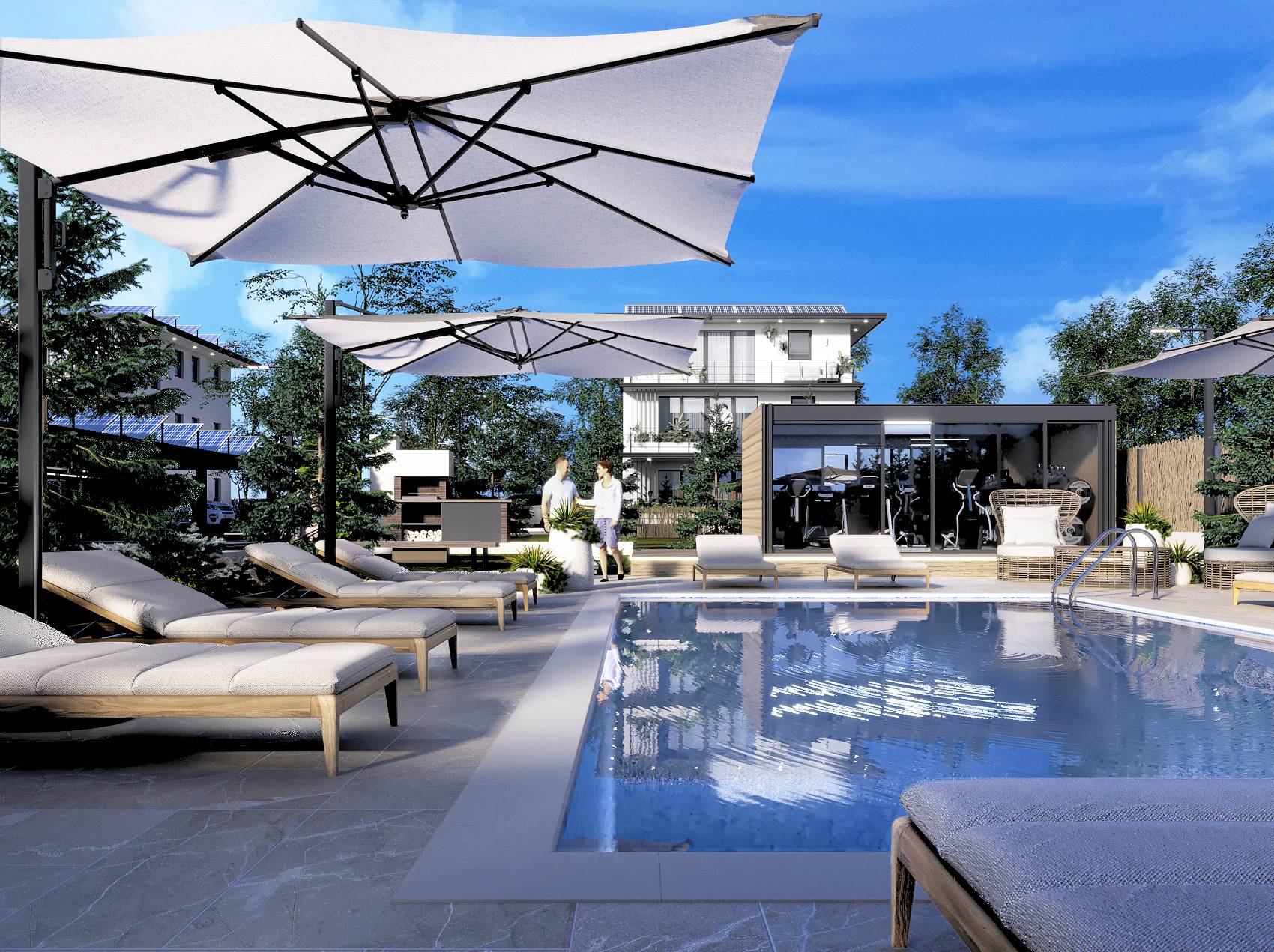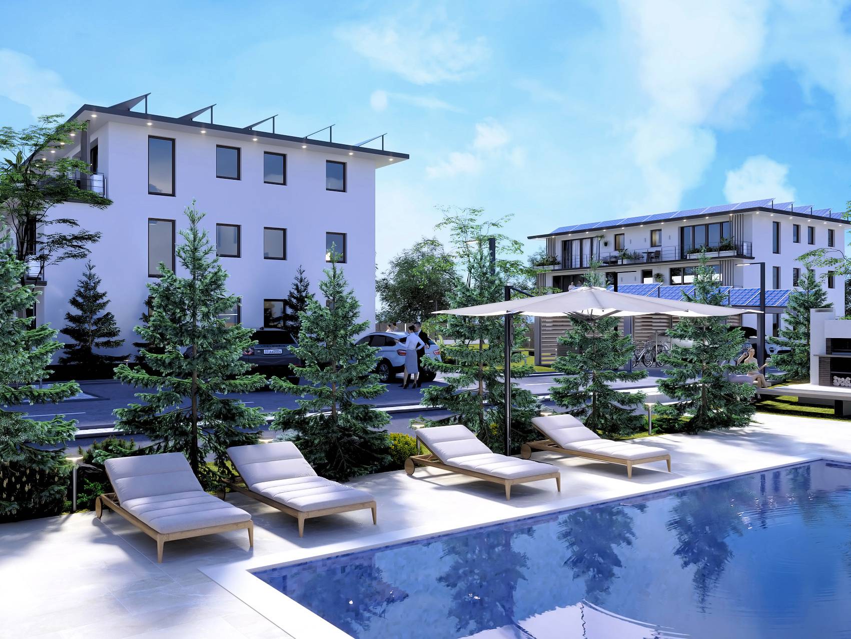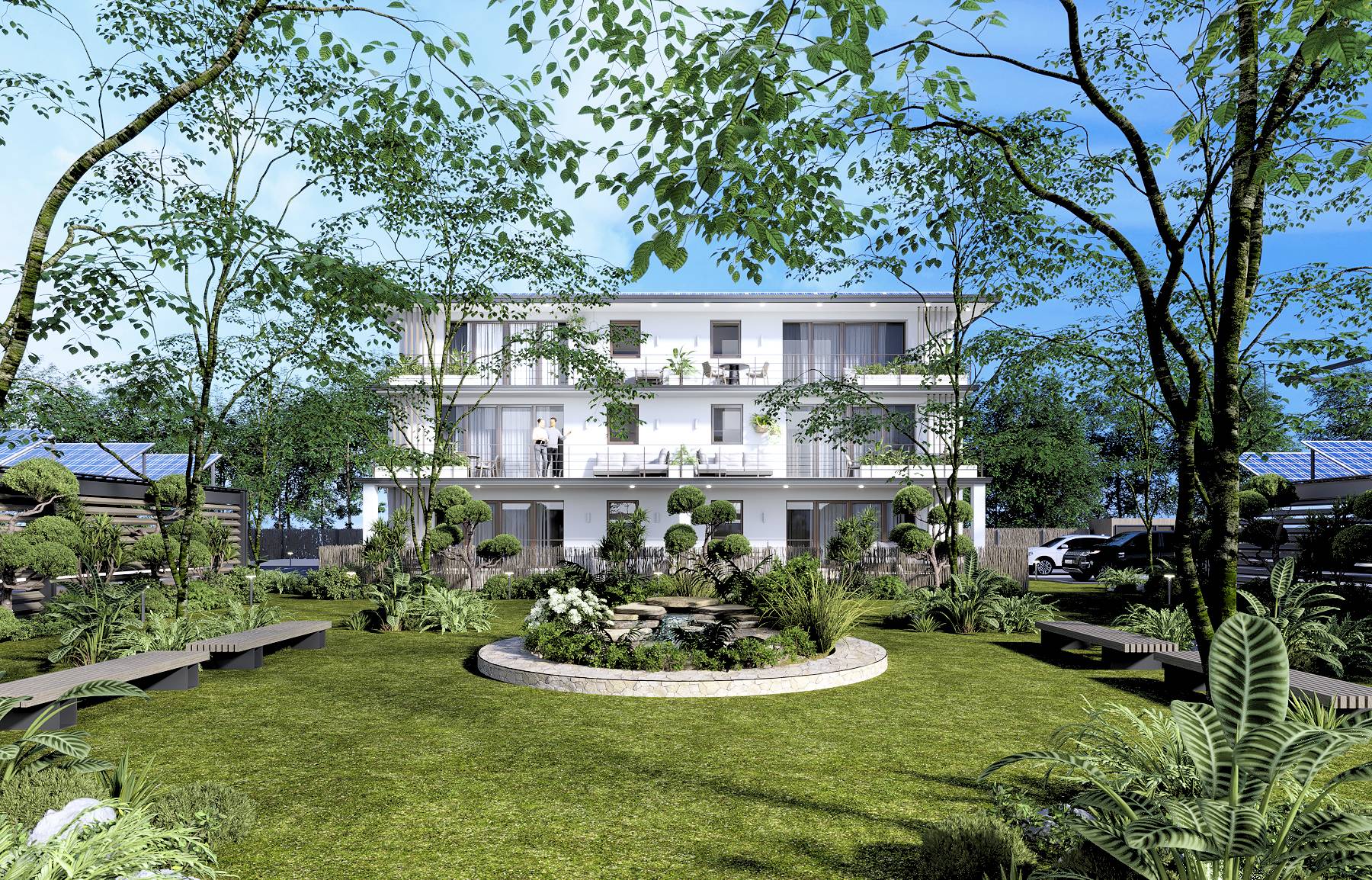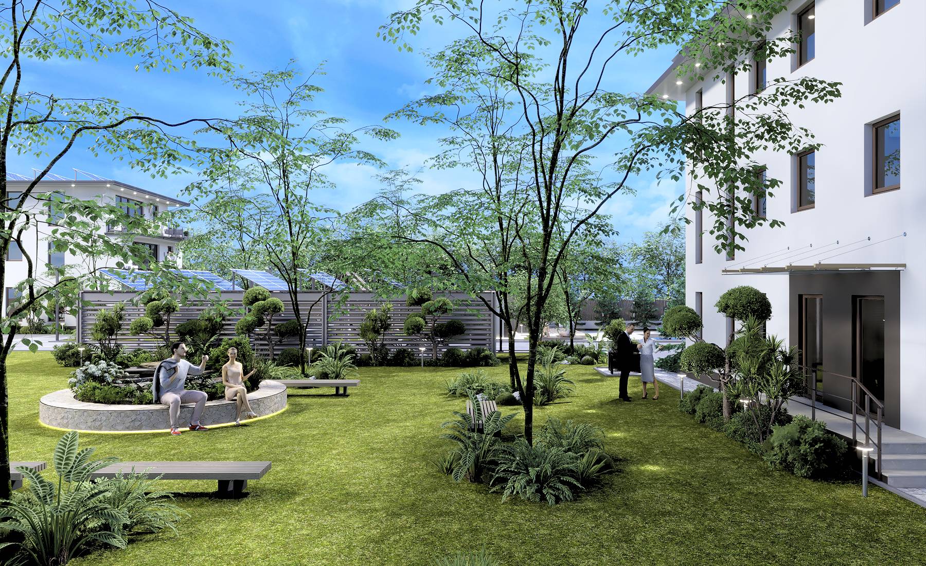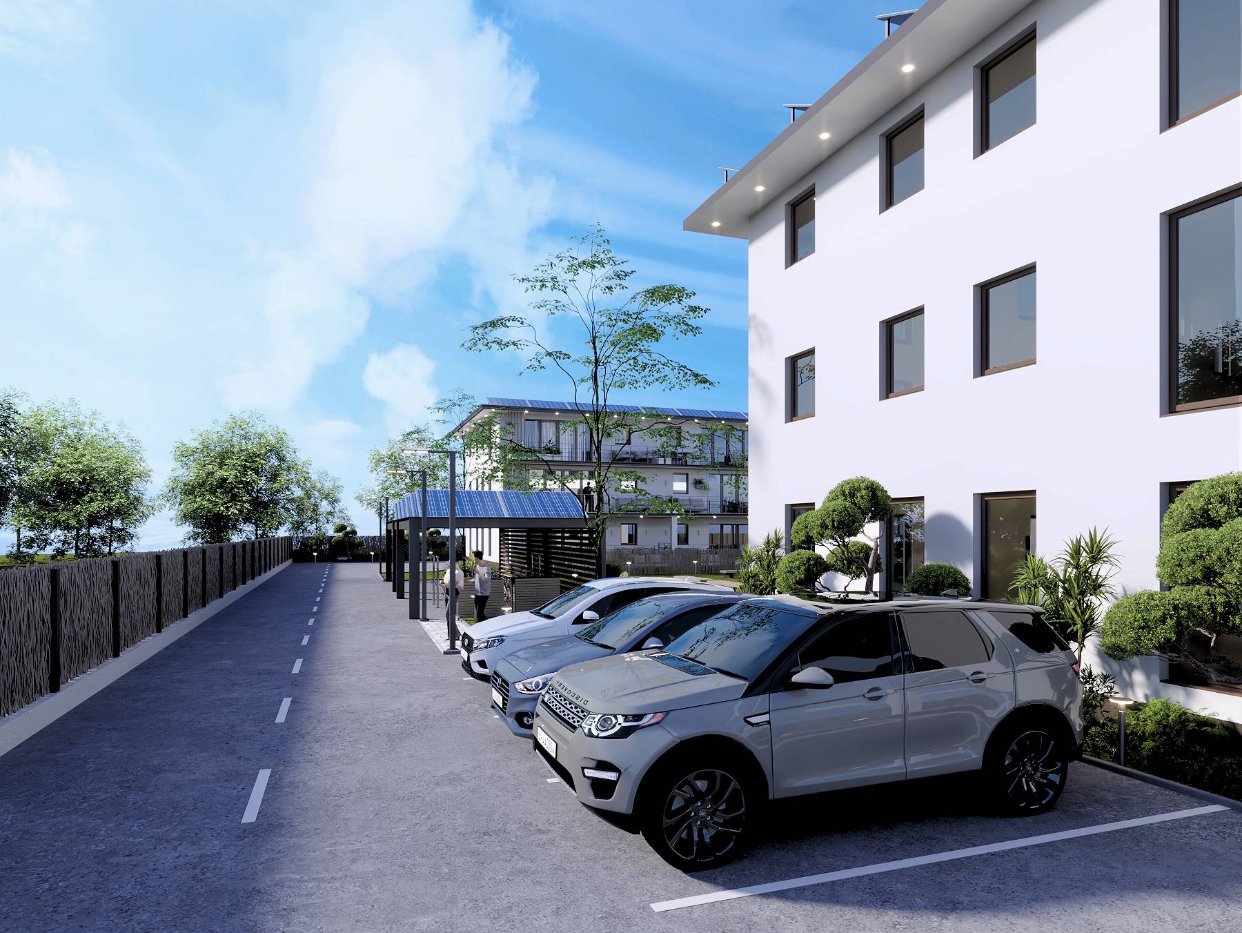 Fiecare apartament este echipat cu sistem fotovoltaic compus din 8 panouri care pot genera 4,2Kwhr impreuna cu sistem de control si stocare in baterii de 15 kW, sistemul fiind dimensionat pentru a acoperi integral consumul necesar în conditii de utilizare optimă.